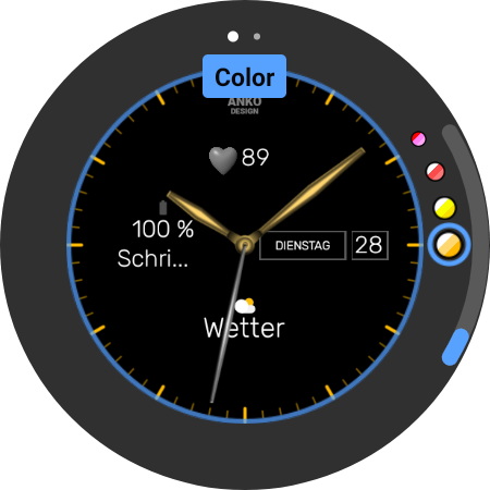 • Um die Wetter Komplikation auf der Smartwatch einzustellen, lange auf die Mitte der Uhr tippen.